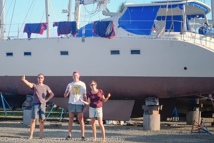 In the summer it’s time again to Haul out Yemaya and do some bottom painting. Instead of the ablative anti fouling which has to be repainted each year this time we will put on a hard paint called coppercoat.This paint is much more environmental friendly and the boat doesn’t have to be repainted anymore. However you can’t paint this paint on top of old paint. The bottom had to be completely stripped.In the first picture you can see the totally white and paint free boat. The new paint is a mix from epoxy and lots of copper. In the second picture you can see the bottom shining from all this copper. It looks like the bottom is completely made from copper. The copper protects the boat against marine growth without ppoisoning the water. We are ready again for a new charter sailing season!